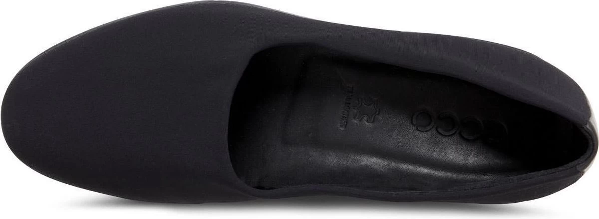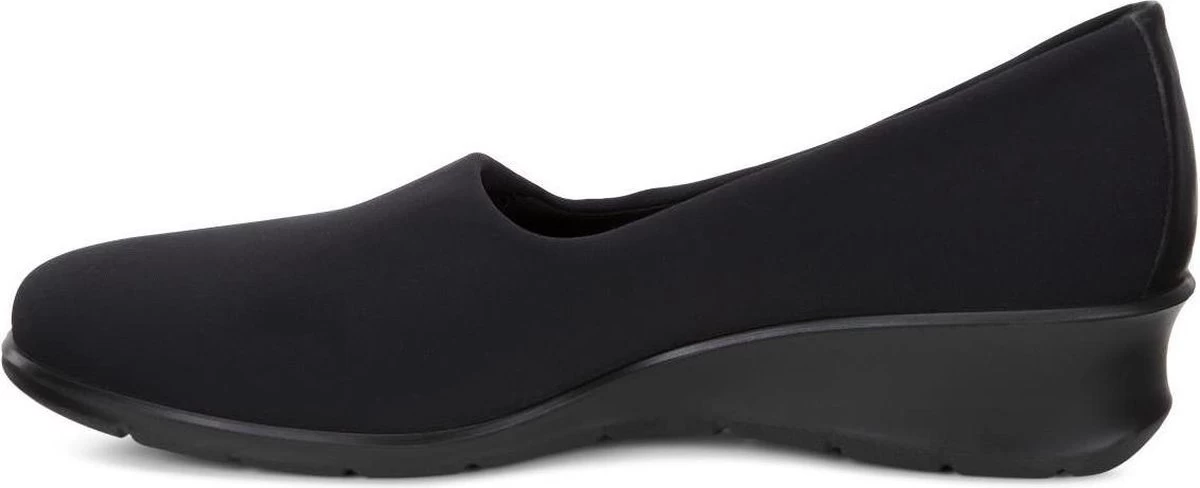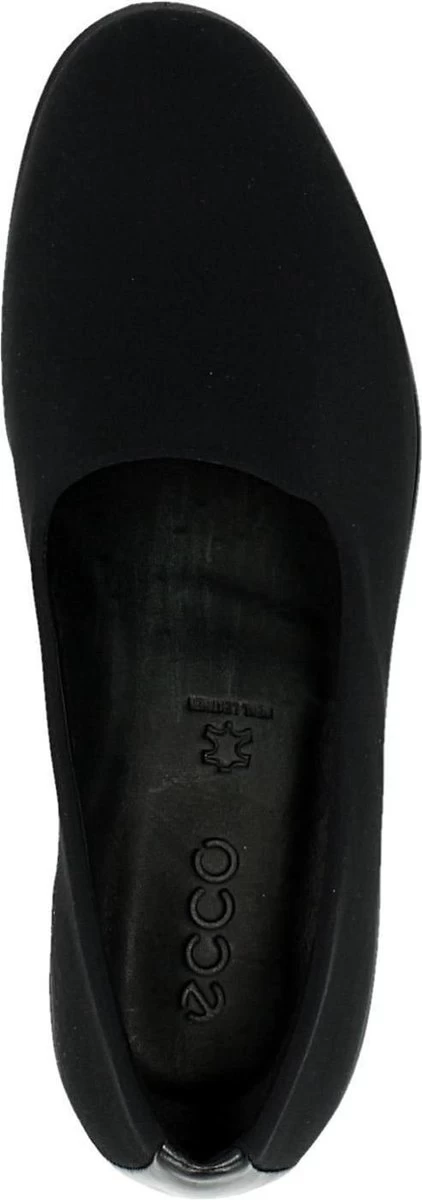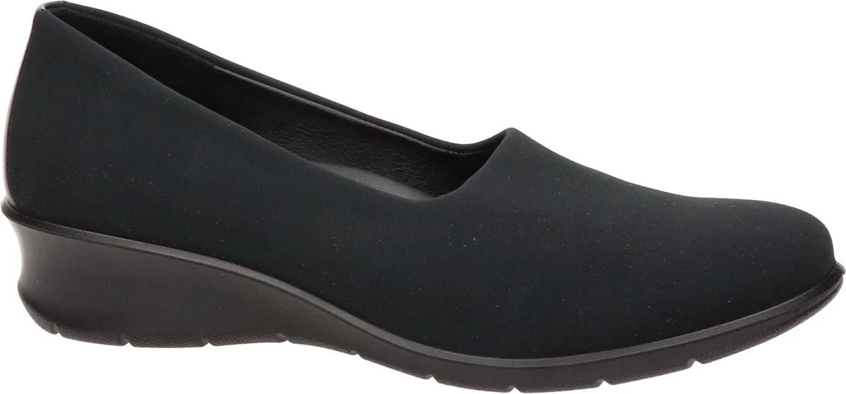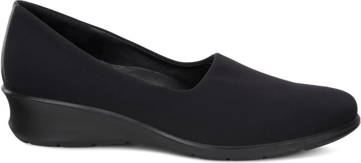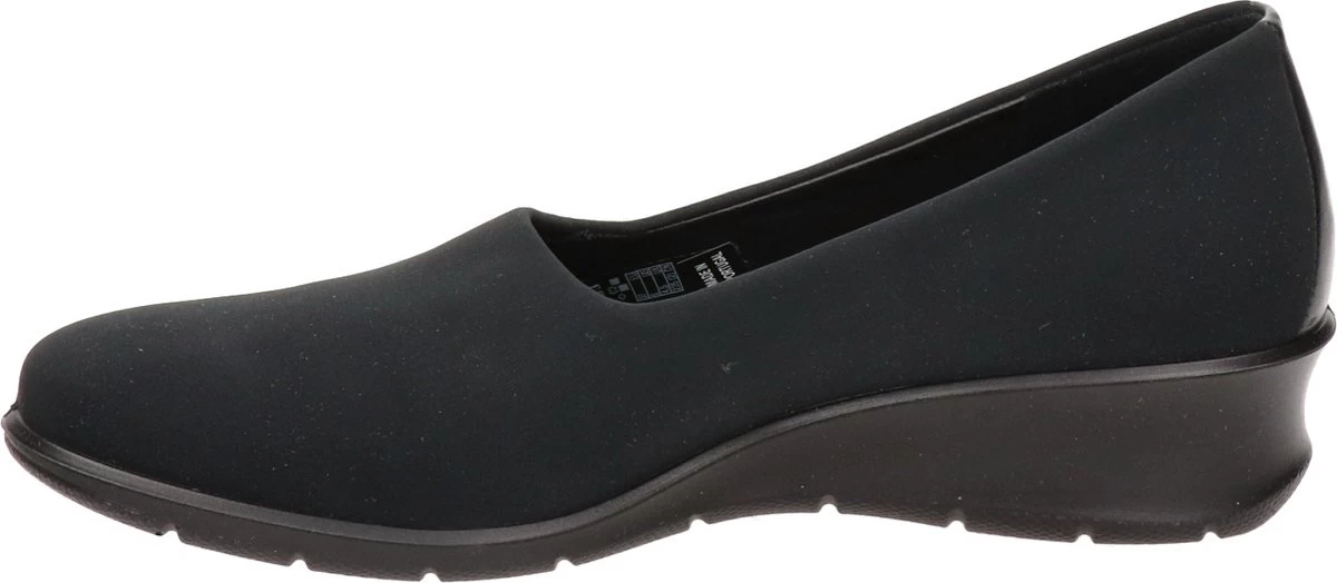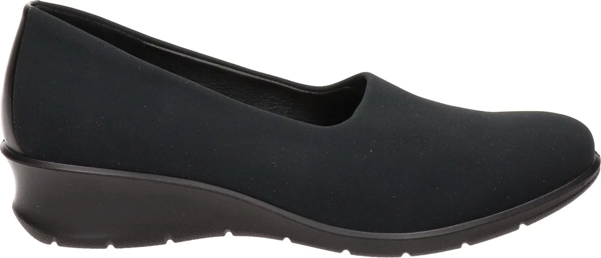 Zwarte Ecco Felicia instappers gemaakt van leer, net zoals de comfortabele binnenzool en de voering. Ter decoratie zijn er stiksels en een merkopdruk op de binnenzool aangebracht. De rubberen zool is voorzien van een wedgehak met een hoogte van 4 centimeter. Het voetbed van de Ecco Felicia instappers is niet uitneembaar.