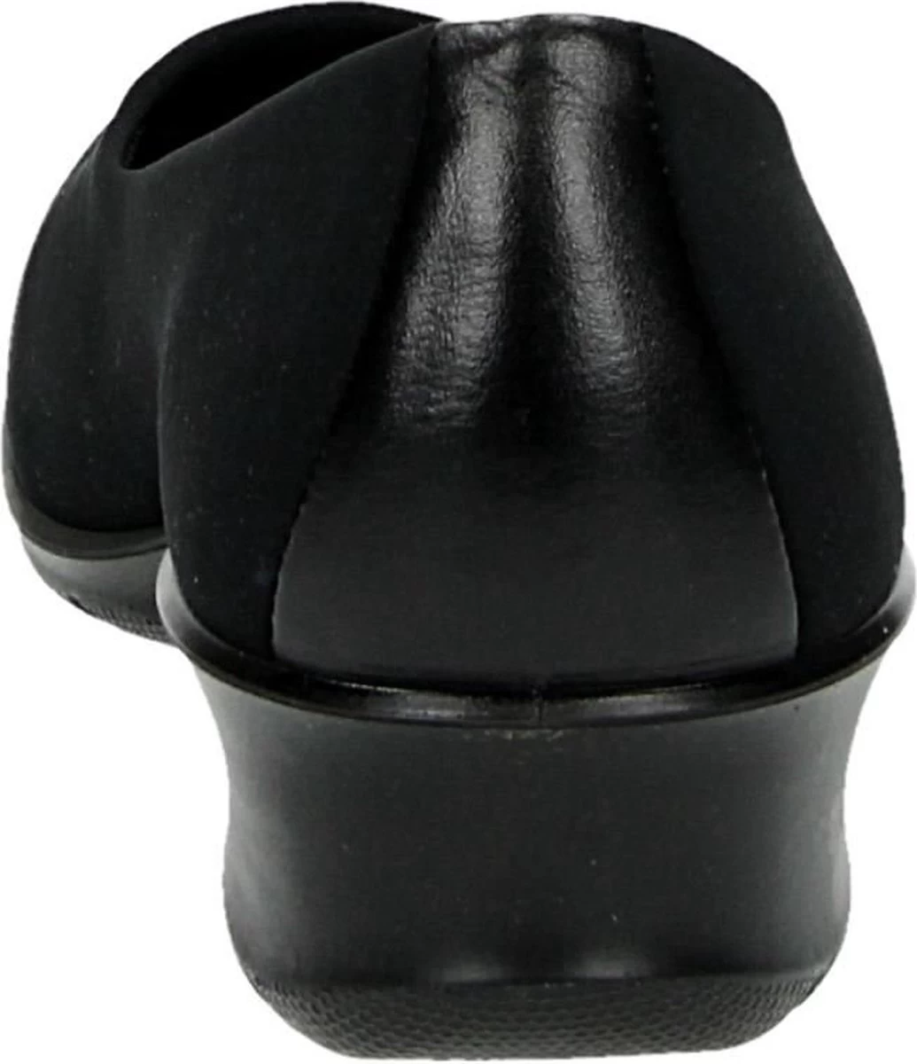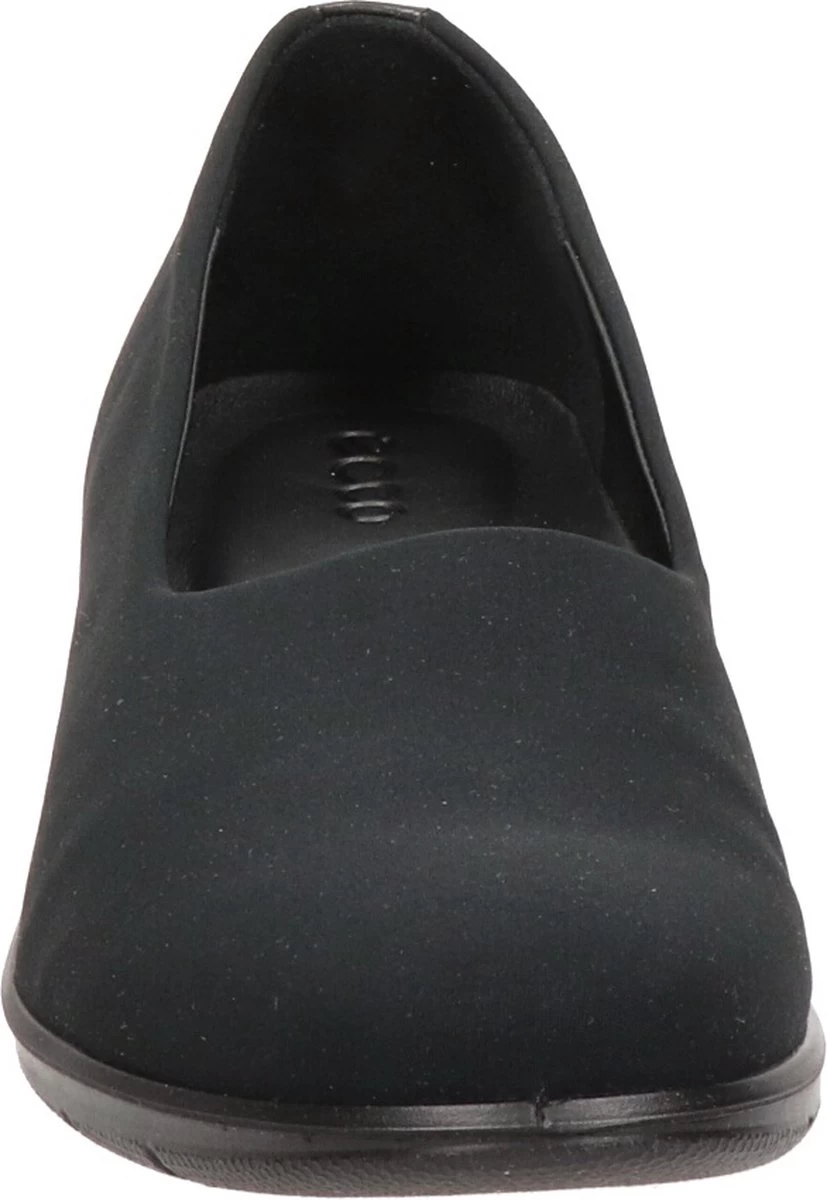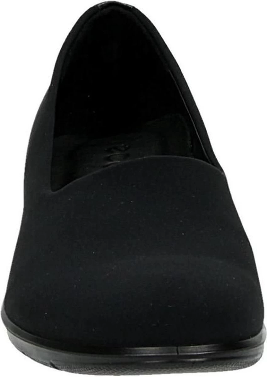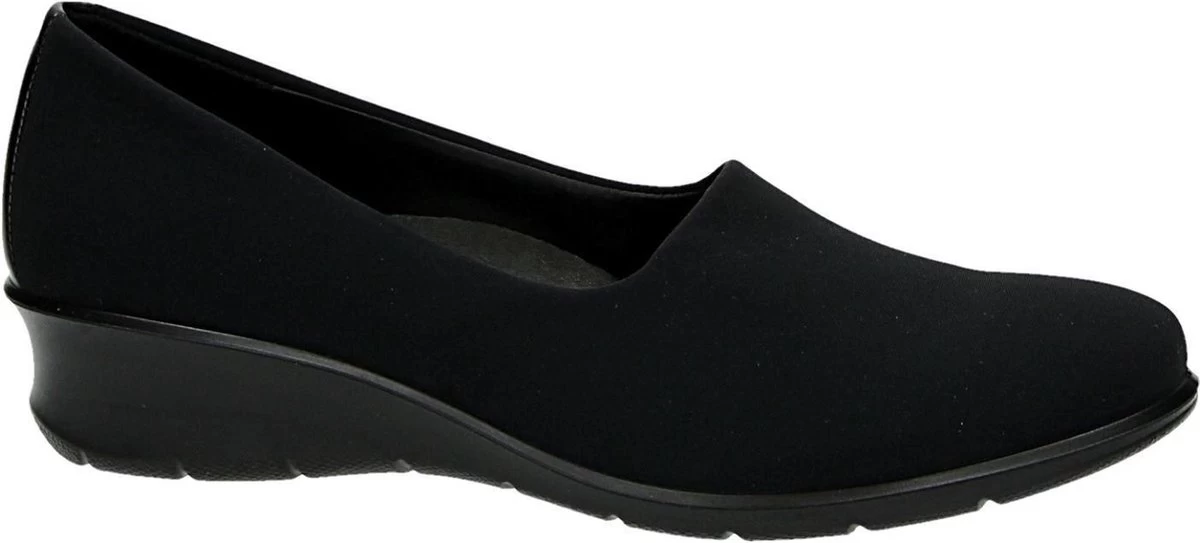 Zwarte Ecco Felicia instappers gemaakt van leer, net zoals de comfortabele binnenzool en de voering. Ter decoratie zijn er stiksels en een merkopdruk op de binnenzool aangebracht. De rubberen zool is voorzien van een wedgehak met een hoogte van 4 centimeter. Het voetbed van de Ecco Felicia instappers is niet uitneembaar.